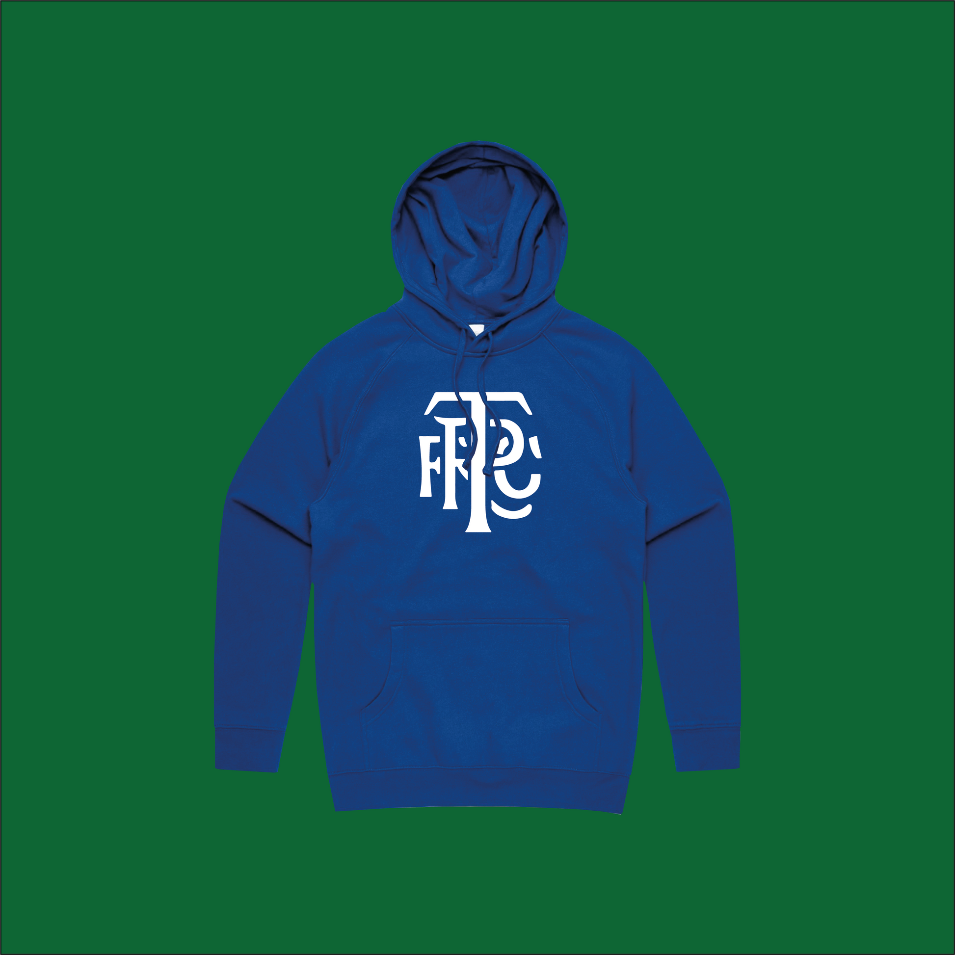 Celebrate your Tranmere pride in style with our TRFC Retro Crest Hoodie. Featuring a classic intertwined crest in bold white print, this premium royal blue hoodie combines timeless design with everyday comfort.